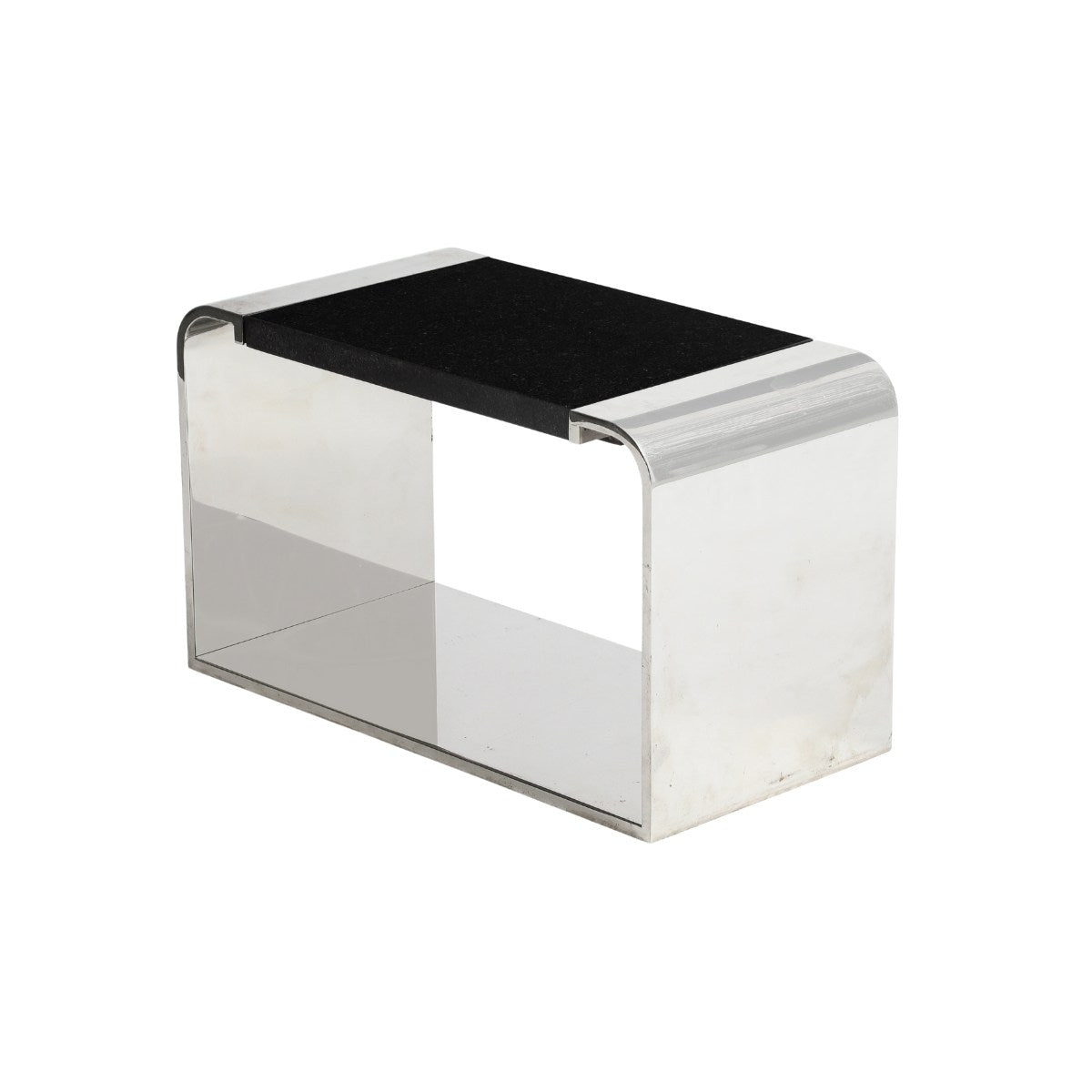 The modern polished mirrored steel waterfall table has a removable polished black granite top.